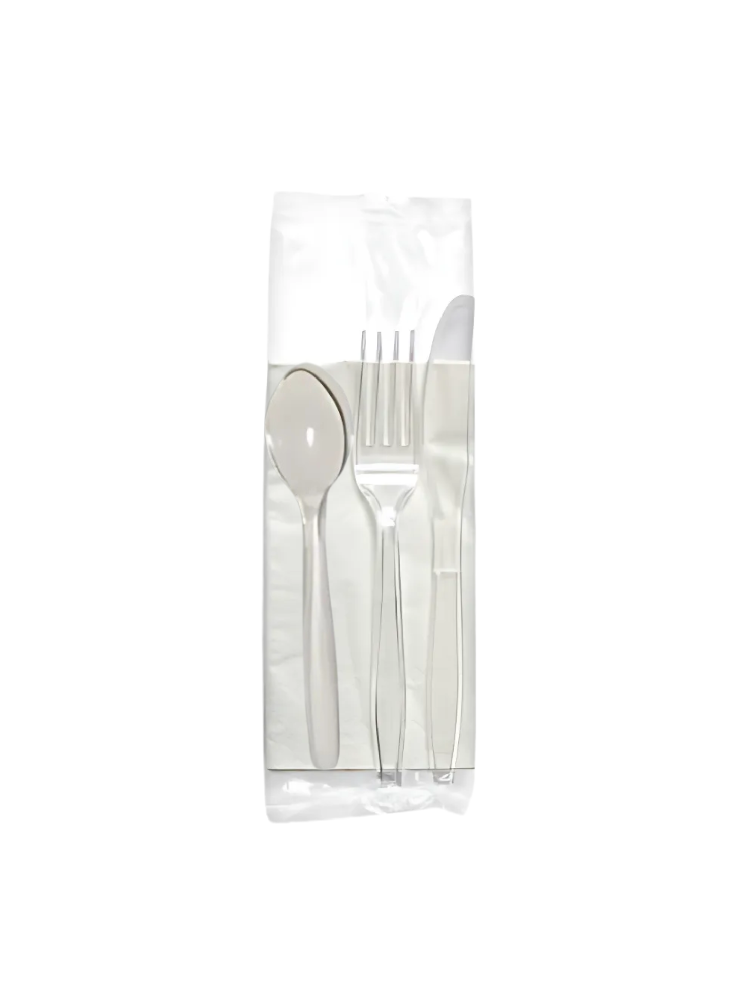 Το κουβέρ ΔΦ (διάφανο φιλμ) αποτελεί μια ολοκληρωμένη, επαγγελματική λύση σερβιρίσματος με τρία διαφανή πλαστικά μαχαιροπίρουνα Premium Plus 18cm (μαχαίρι, πιρούνι, κουτάλι) και λευκή χαρτοπετσέτα 33x33cm / 1 φύλλο. Κατάλληλο για catering, μαζική εστίαση, delivery και take away, εξασφαλίζει υγιεινή, ταχύτητα εξυπηρέτησης και αισθητική αρτιότητα.