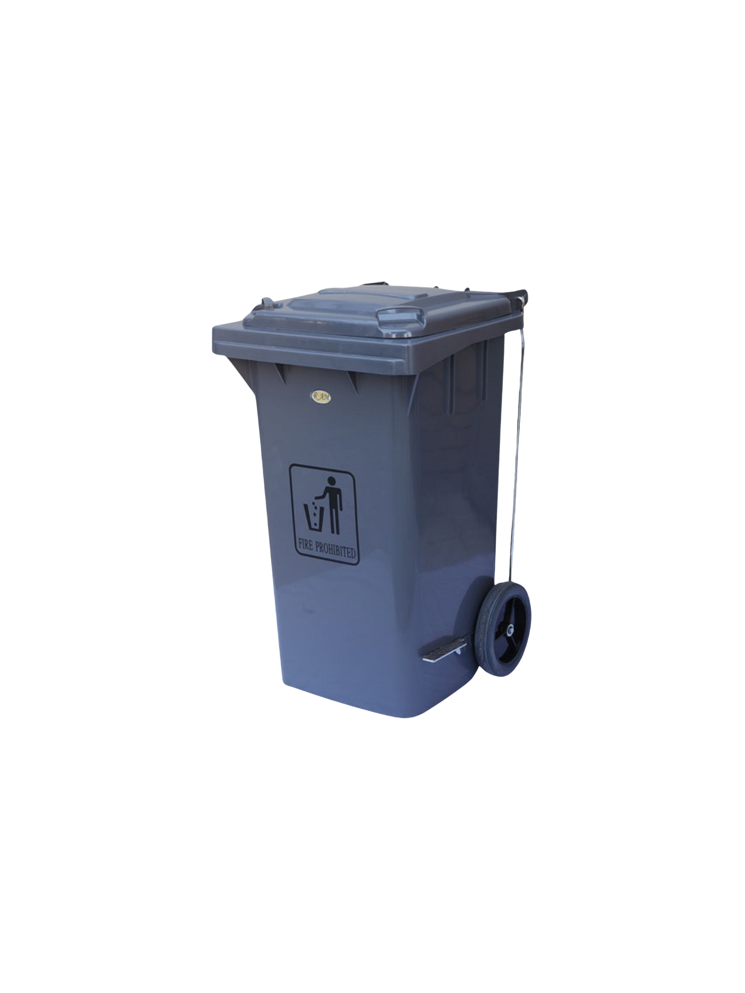 Ορθογώνιος κάδος απορριμμάτων 240 λίτρων, κατασκευασμένος από ανθεκτικό πλαστικό, με πλαϊνό μεταλλικό πεντάλ για άνοιγμα του καπακιού χωρίς επαφή με τα χέρια και 2 ρόδες βαρέως τύπου για εύκολη μετακίνηση.