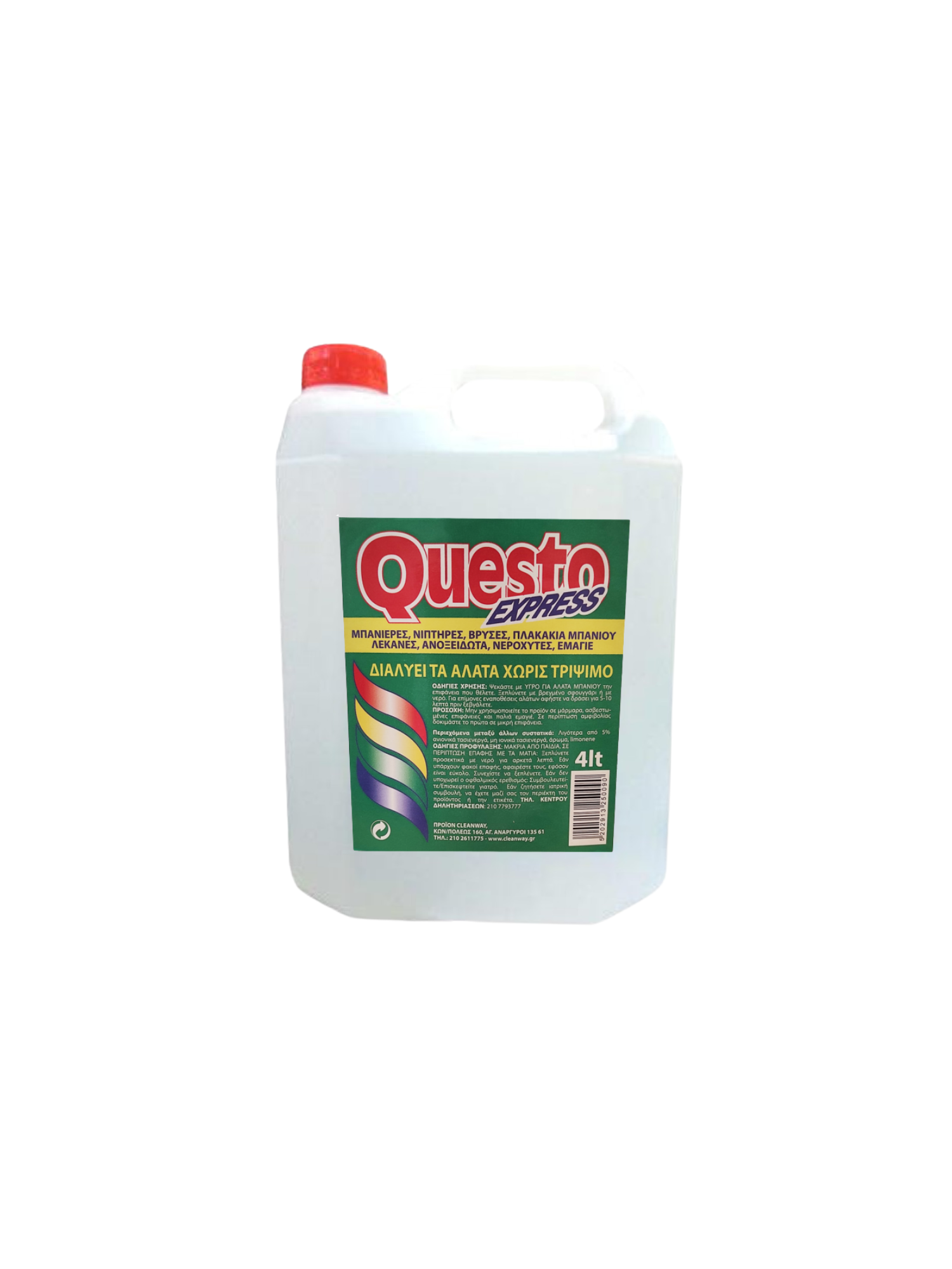 Το Questo Express, σε δοχείο 4 λίτρων, είναι ένα ισχυρό υγρό καθαριστικό αφαλάτωσης κατάλληλο για τουαλέτες, νιπτήρες, μπανιέρες, πλακάκια και είδη υγιεινής. Η σύνθεσή του απομακρύνει αποτελεσματικά άλατα, σκουριά, υπολείμματα σαπουνιού και οργανική ρύπανση, αφήνοντας τις επιφάνειες λαμπερές και υγιεινές.
