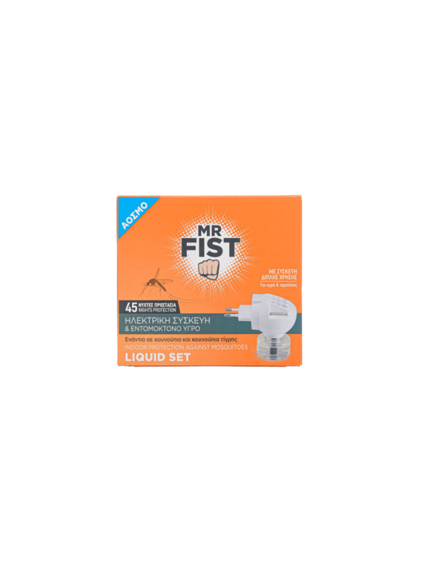 Το σετ συσκευής εντομοαπωθητικού υγρού/ταμπλέτας Fist είναι ιδανικό για την προστασία από ενοχλητικά έντομα σε εσωτερικούς χώρους. Η συσκευή Fist λειτουργεί αποτελεσματικά με υγρό ή ταμπλέτα για να κρατήσει τα κουνούπια και άλλα έντομα μακριά για έως 45 νύχτες. Το σετ περιλαμβάνει τη συσκευή και ένα ανταλλακτικό υγρού, το οποίο εξασφαλίζει τη συνεχιζόμενη προστασία για μεγάλο χρονικό διάστημα.